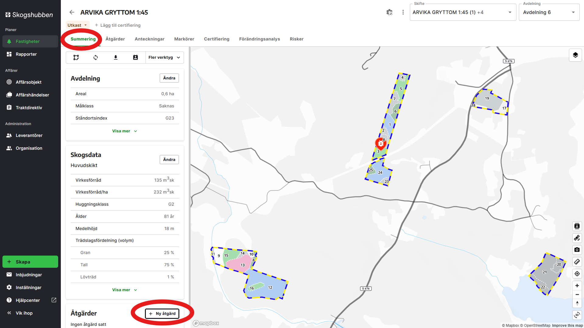 - Välj avdelningen genom att klicka i kartan eller välj från menyn överst i kartan. Är du på fliken "Summering" så scrollar du längst ner och klickar "+ Ny åtgärd". Alternativt klicka på fliken "Åtgärder" och klickar på knappen "+ Ny åtgärd". Se bild nedan.