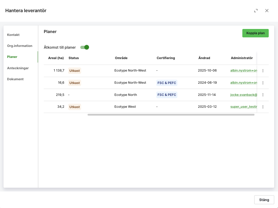 Här ser ni vilka leverantörer som din organisation har kontakt med samt kontaktperson och kopplade planer för varje leverantör.