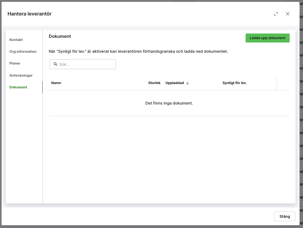 För att ge åtkost till ett dokument, klicka på dokument , ladda upp dokument. Klicka sedan på ge åtkomst. När du gjort det får leverantörer tillgång till dokumentet du laddat upp.