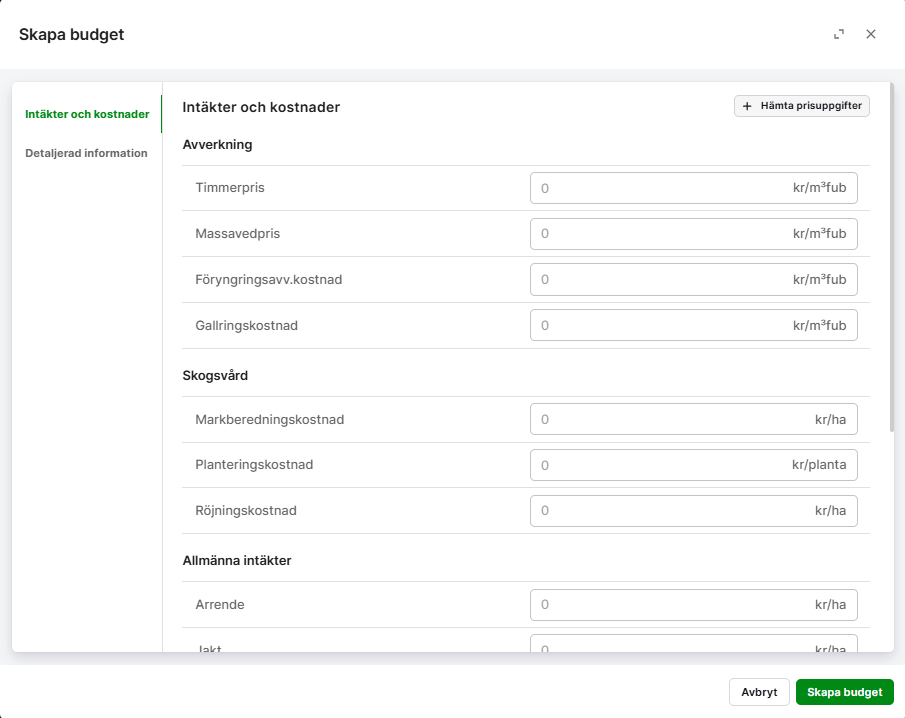 - Välj om planen ska beräknas med Skogshubbens värden genom att klicka på" Hämta prisuppgifter" eller skriv in dina egna manuellt. Du kan också hämta Skogshubbens värden och sen justera manuellt.