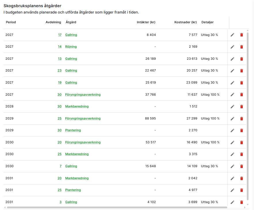 En tabell som visar skogsbruksplanens åtgärder och hur de påverkar budgeten. Du använder åtgärderna som grund för planeringen och kan justera värden vid behov.