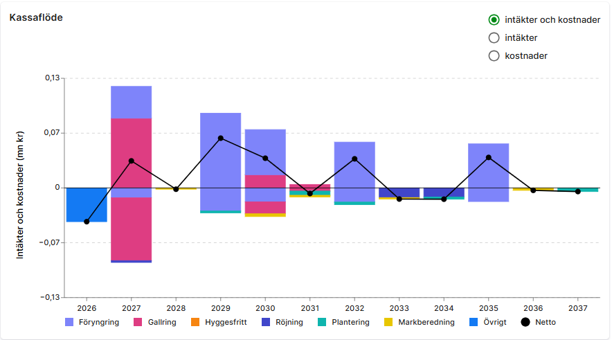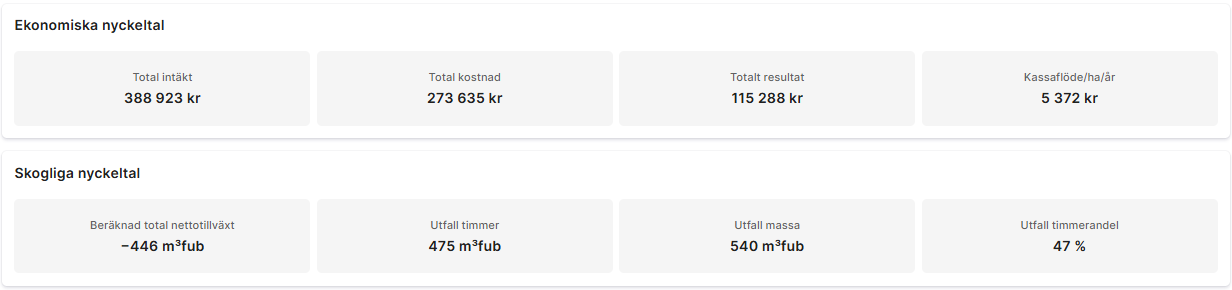 - Följ nyckeltal, kassaflöde (graf + tabell) och virkesförråd över tid för att utvärdera och förbättra planeringen.