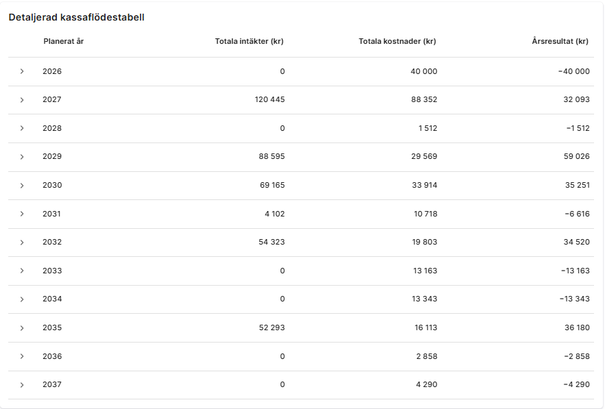 En graf som visualiserar kassaflödet över tid och gör det enkelt att se variationer mellan år. Även en tabell som kompletterar grafen och gör det lätt att läsa av exakta värden per år/period.