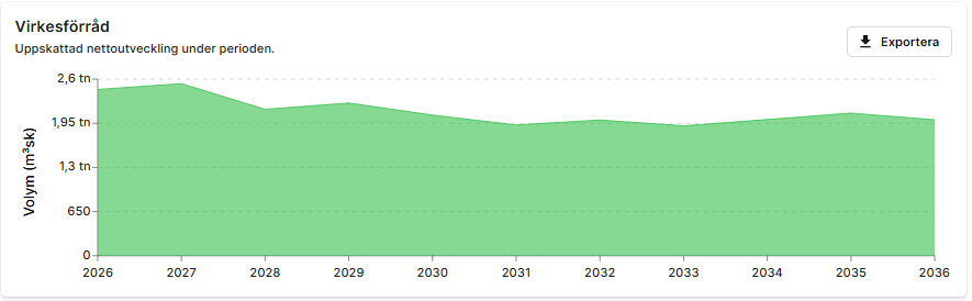 Sist men inte minst en graf som visar hur virkesförrådet utvecklas över tid utifrån planerade åtgärder och valda antaganden.