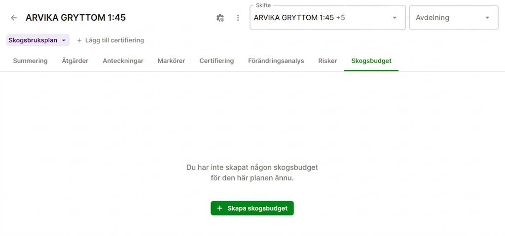 - Öppna fastigheten och säkerställ att det finns åtgärder i skogsbruksplanen. Gå sedan till fliken “Skogsbudget”.