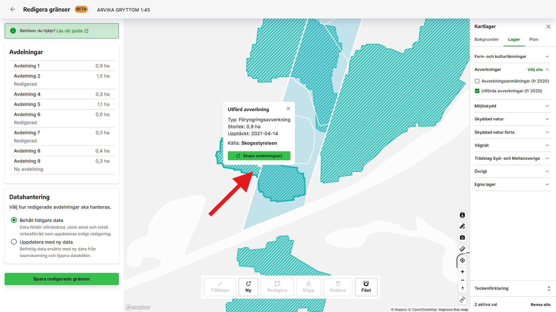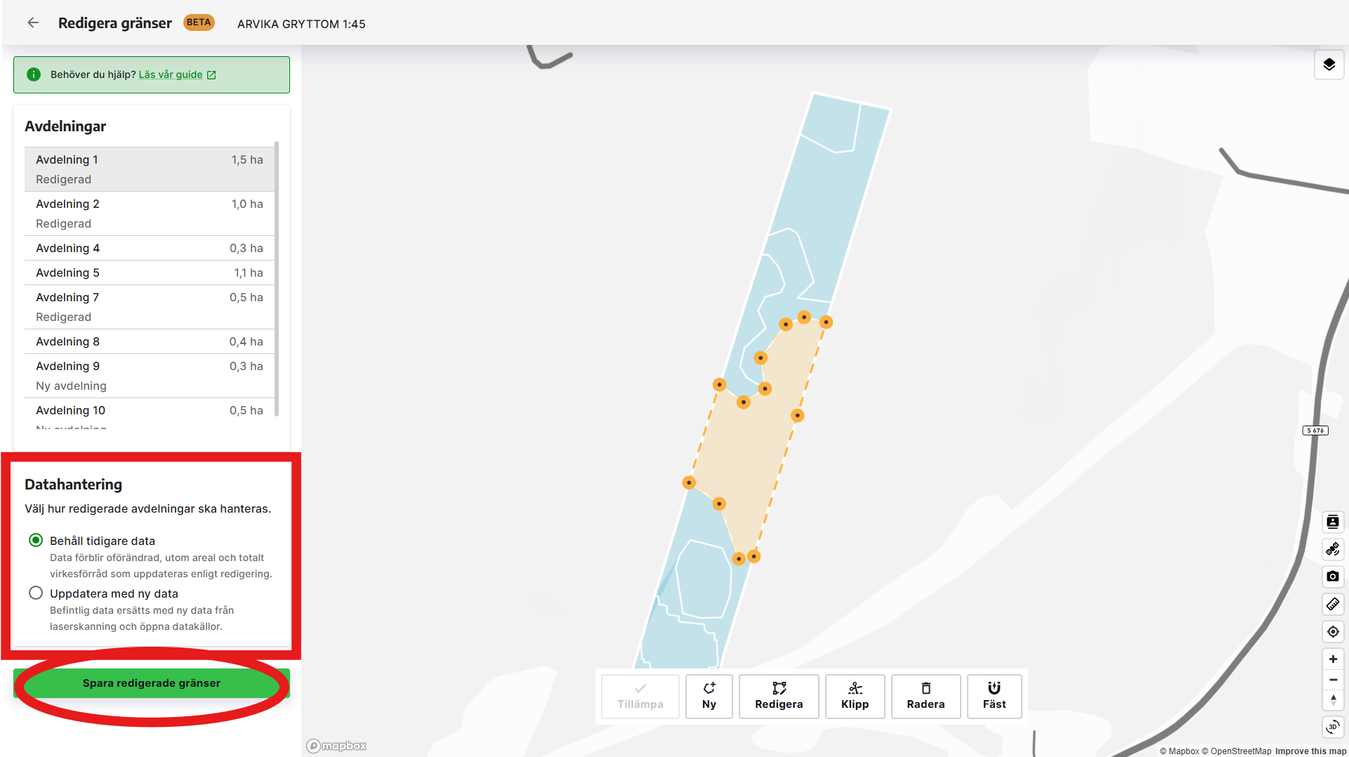 Kom ihåg att spara dina ändringar! Klicka på "Spara redigerade gränser" under sektionen "Avdelningar". Du kan välja på att behålla avdelningsdatat eller uppdatera avdelningarna direkt med laserdata. Det är endast dina redigerade avdelningar som påverkas av valet.
