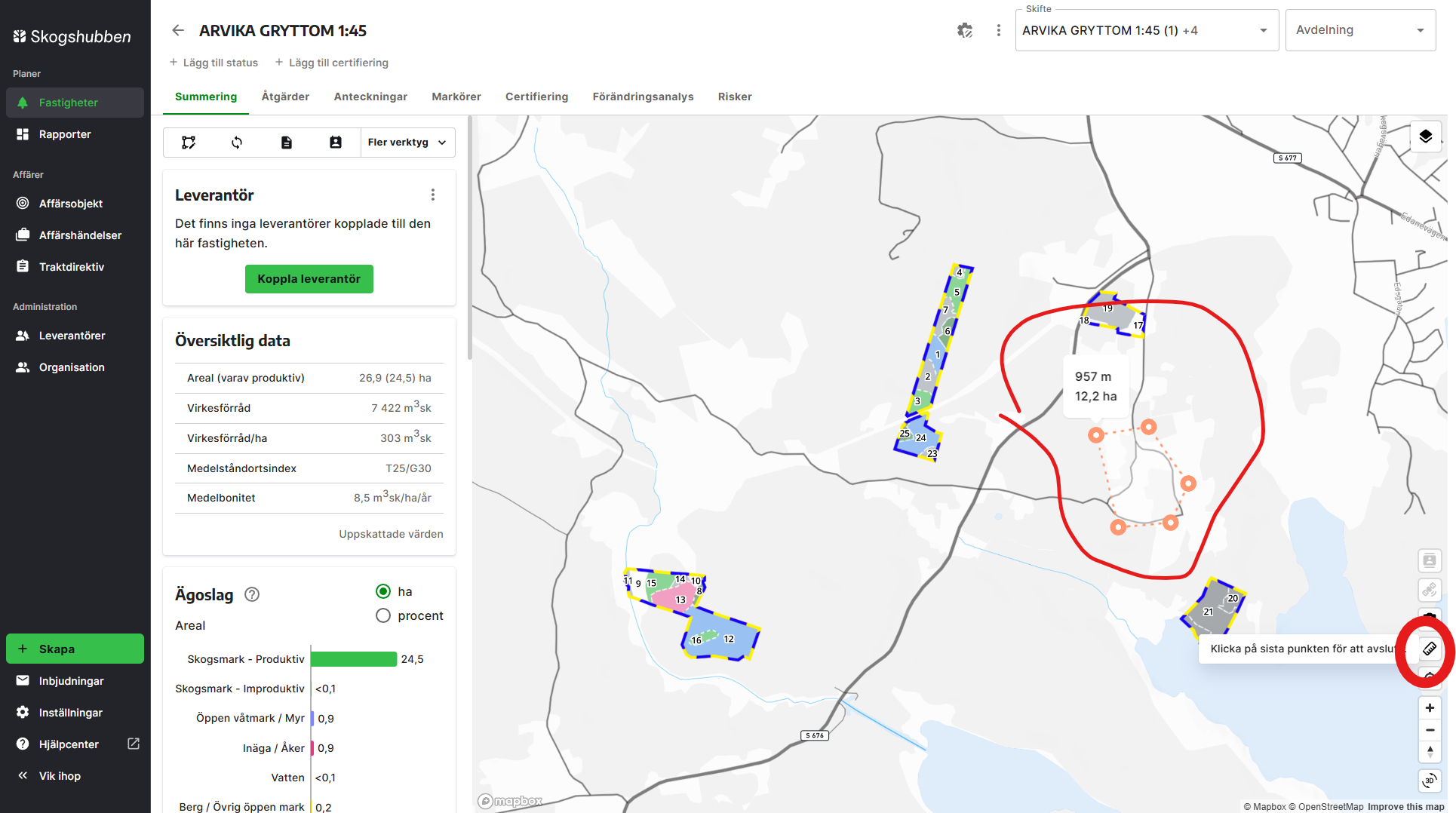 - När du har fler än två punkter kommer du att se både avstånd och area.