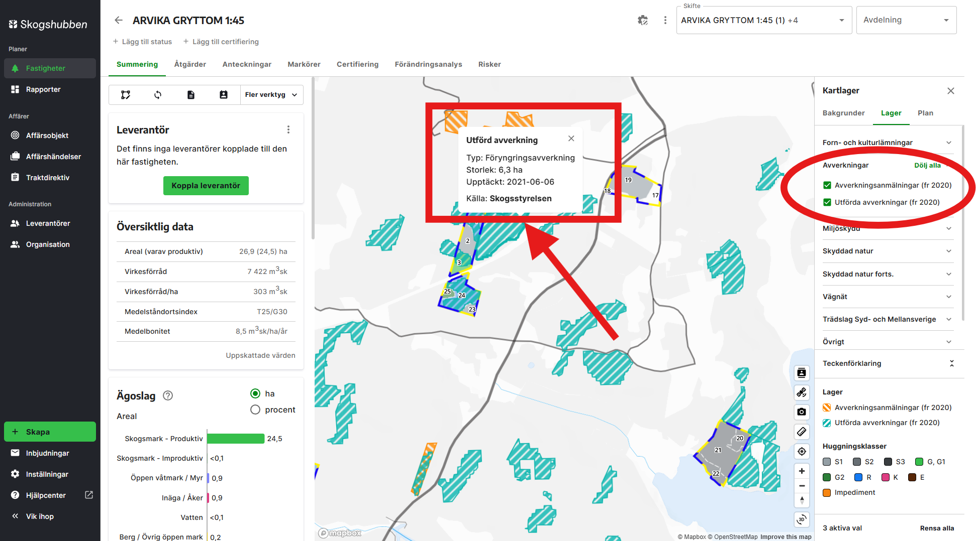 För att se avverkningar i kartan behöver du slå på det kartlagret. Våra avverkningslager hämtar data från 2020 och senare.